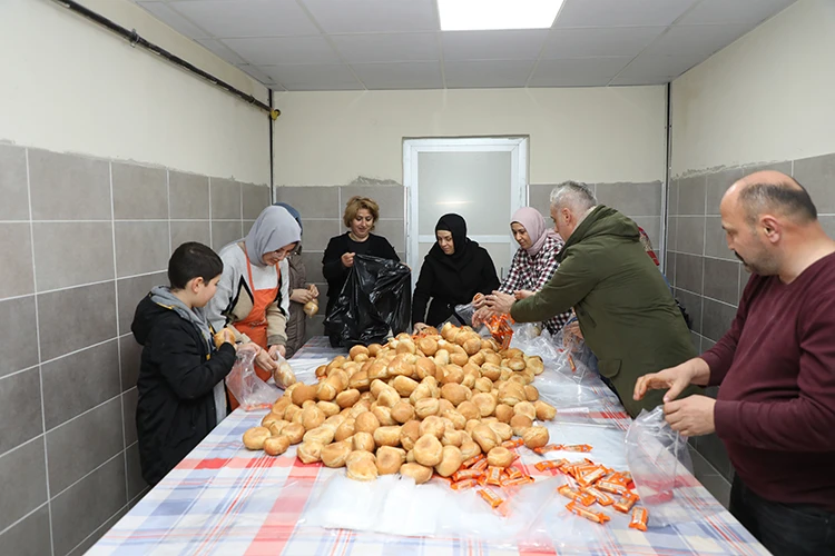 Gönüllü öğretmen ve öğrenciler, okulun fırın atölyesinde günde 10 bin küçük yuvarlak somun ekmek üreterek helvayla Valilik koordinesinde ihtiyaç duyulan bölgelere gönderiliyor.