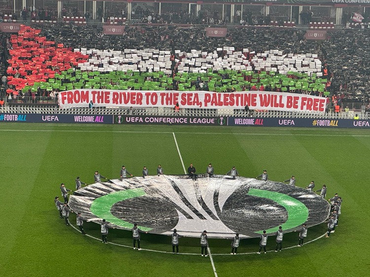 Stadyumun tamamında kartonlarla Filistin bayrağı oluşturan taraftarlar İngilizce, "Nehirden denize kadar Filistin özgür olacak" ifadesinin yazılı olduğu pankart açtı.