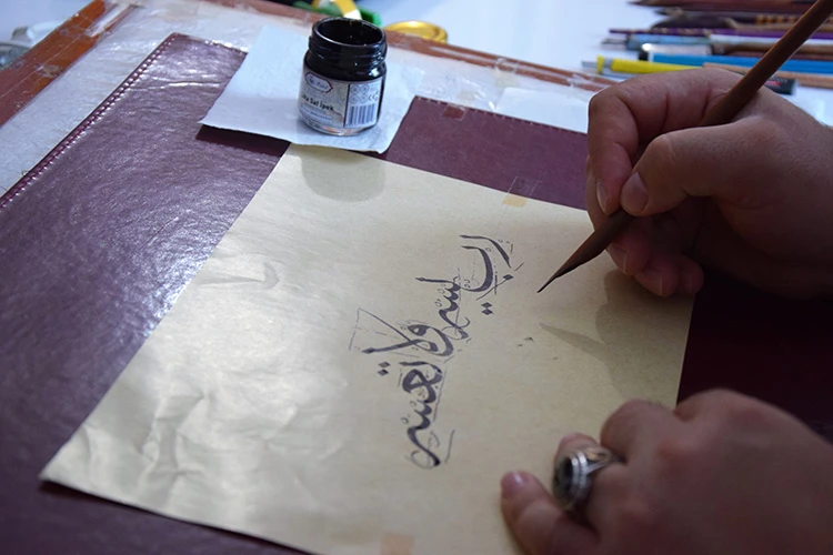 Hocamıza danışıp, eksikleri giderip, yazının en uygun halini almasını sağlıyoruz. Sonra özel olarak yapılan aharlı kağıda yazımızı kamış kalem ve orijinal is mürekkebi kullanarak yazıyoruz.