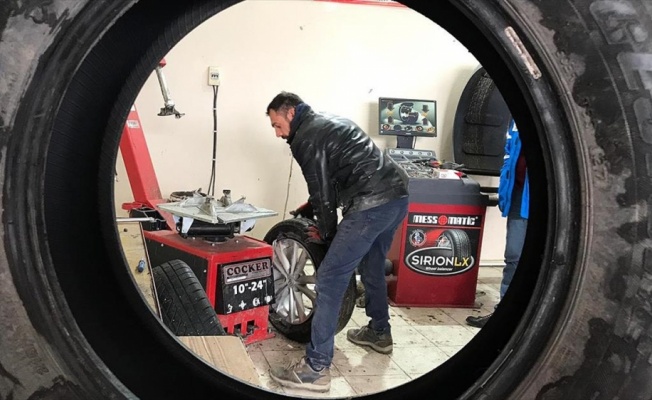 Kars'ta sanayi sitesine araç lastiklerini değiştirmeye gelen vatandaşların taleplerini karışlamaya çalışan sanayi esnafı da yoğun mesai harcıyor.