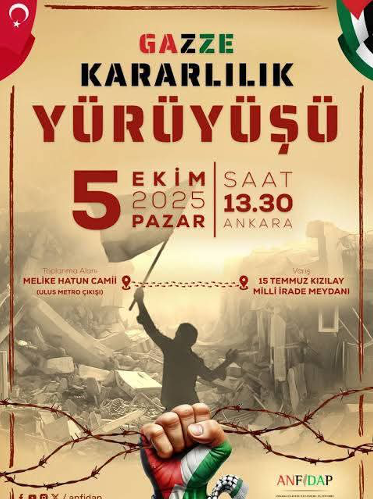 Sözcülüğünü İsmail Mansur Özdemir’in üstlendiği Ankara Filistin Dayanışma Platformu (ANFİDAP) öncülüğünde 5 Ekim 2025 Pazar günü Ankara’da gerçekleştirilen yüzbinlerin katıldığı “Gazze Kararlılık Yürüyüşü”nde, gençlik yıllarımdaki Kudüs mitinglerinde hissettiğim o aynı ruh ve coşkuyla yerimi aldım.