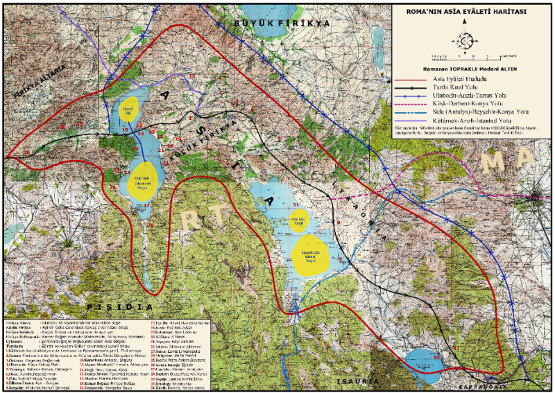 Har.1: Asia [Anatolikon] eyaleti, Eğirdir ve Beyşehir göllerinin eski hâlleri, Küçük Firikya [Firikya Epiktetos], Kıral Yolu, diğer tarihî yollar ve tarihî kentler.