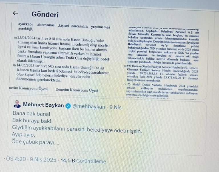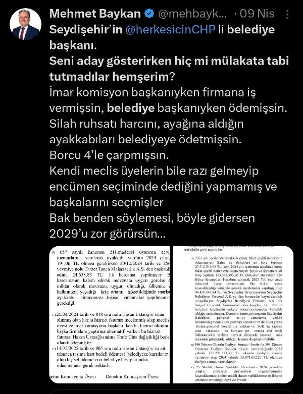 Seydişehir Belediyesi’nde 5393 Sayılı Belediye Kanunu’nun 25. maddesi kapsamında hazırlanan ve denetim komisyonu üyelerinin muhalefet şerhiyle sunduğu raporu Nisan ayında paylaşan Baykan, o dönemde CHP’de olan Ustaoğlu için şu ifadeleri kullanmıştı: