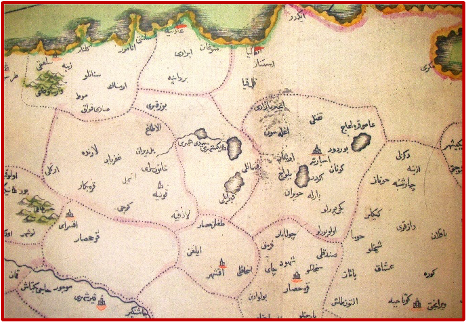 Har.3: Kâtip Çelebi [1609-57]. Burdur, Eğirdir, Kıreli, Beyşehir ve Seydişehir [Karaviran veya Suğla] gölleri. Açıklama: Kâtip Çelebi haritasının üstü güney gösterir.