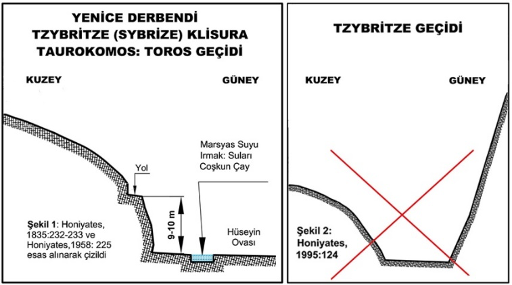05. Tzybritze geçidi adı, Fransızca çeviride Sybrize, Latincede Clisura Zybrize yazılmıştır. Khoniates, “Sultan, Miryokefalon’dan sonra yolun darlaştığı yeri işgal etti”; Turan, “Bizans ordusu Miryokefalon denilen dar ve sarp bir vadiye girdi; Sybrize denilen çıkış yerinde sultanın kurduğu pusuya düştü” der (1995: 124; 1998: 208). [b] harfi genelde [v] ve [f] sesi verdiğine göre Sybrize veya Zybrize, Türkçe Sivrice ve Sivrisi okunur. Tzibrelitzemani, Manuel’in mektubunda Cybrilcymani geçen kelime de asla Çivril okunmaz. Cybrilcymani, Sivri’l-Simani [Semmâni] okunur ve Yağcı Sivrisi demektir. Burası için, Pion [yağ saklanan] Tepe denir (Ramsay, 1960: 117). Cybrilcymani, 1186 rakımlı küçük sivri ile 1304 rakımlı büyük sivriden oluşan iki tepeli Yenicesivrisi’dir. Bet-Toman [Beth Thomas] burasıdır (Ebû’l-Ferec, 1950: 421-422; bk. Har.4). Tzybritze ve Sybrize, kelimelerinde asla “ç ve l” sesleri yoktur.