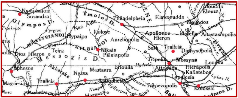 Tarihçi, Anadolu’daki ilk yedi kiliseyi, Efes, İzmir, Bergama, Filâdelfiya [Alaşehir], Laodikya [Denizli] ve Sart gibi isimlere bakarak yerleştirdi. Hâlbuki Pavlos ve Barnabas buralara hiç gitmediler. Onlar, Asya ili ve Mukaddes Firikya’daki 1- Efes [Gelendost], 2- Laodikya [Eğirdir], 3- Sart [Barla], 4- İzmir [Apameia], 5- Thyateira [Arkadiopolis], 6- Bergama [Gaziri Ad.], 7- Yalvaç’a [Filâdelfiya: Alaşehir] geldiler. Demek: Pion tepesi ile de ilim olurmuş [Har.2].
