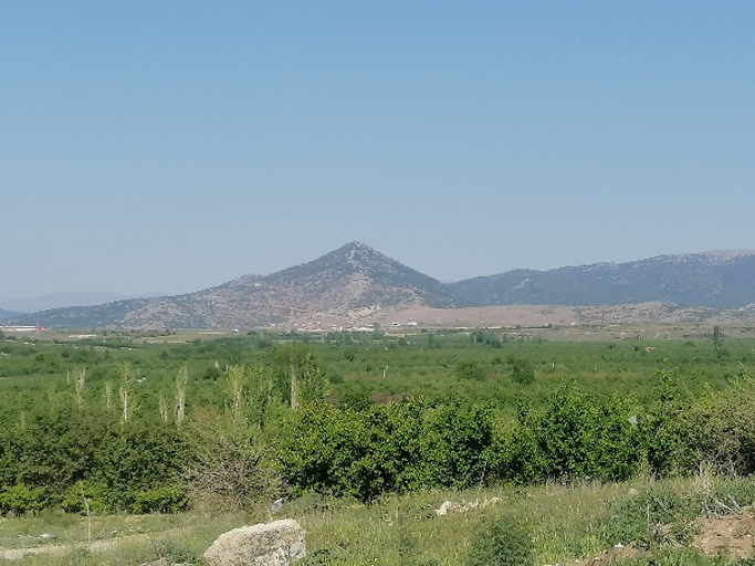 R.3: Gelendost-Kiremitli Burun önündeki Efes’in [Apasa: Arzava] bulunduğu yerden Pion tepesine [Yenicesivrisi] bakış. Foto: İsmail Esen. Soldaki tepe Keçi Sivrisi [Küçük Sivri] 1186, sağdaki Büyük Sivri 1304, arkadaki Çirişli Dağı 1884 rakımındadır. Sivri’de bir in vardır. Resimler yakınlaştırılarak çekilmiştir.
